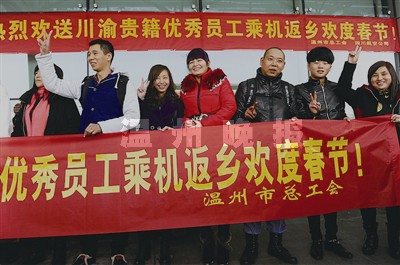 市总工会工作人员称,这已是市总工会第6年组织优秀员工免费乘机返乡。考虑到重庆、四川、贵州等地的外来职工回家路途遥远且比较难买到返乡的车票,今年市总工会特地在今昨两天,安排210名优秀员工分批搭乘温州到重庆、成都以及贵阳的航班返乡。这些优秀员工主要是各级劳动模范、先进生产工作者、“双爱双评”先进等荣誉称号获得者。