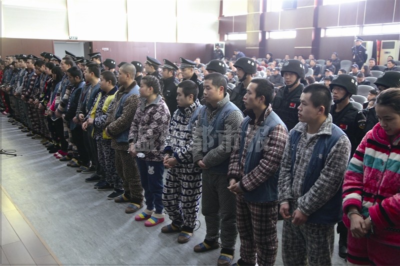 昨天上午10时许,永嘉法院第一审判庭内,32名被告人站成长长的一排(上图)。