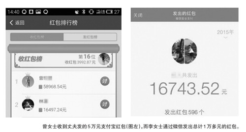 支付宝官方限制单个红包金额上限为5万元,“我老公给我发了5万元红包,不在家用范畴,随我支配。”市区曾女士一晒朋友圈,“拉”到不少“仇恨”。有人收到就有人发出,“我一共发出了16743.52元的微信红包,每次都是达到上限200元。昨天一看总额都吓一跳呢。”家住下吕浦的李女士表示。