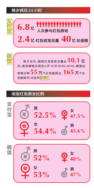 朋友聚会抢红包;相亲抢红包测试对方性格;长辈给小辈发红包;麻将赢了钱,把钱发到群里大家抢红包——今年春节,手机发红包抢红包成了新趋势。