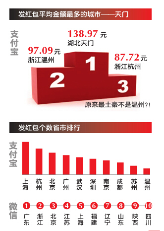 支付宝的数据显示,截至大年初一,温州位列全国发支付宝红包个数最多的前十位城市,红包的平均金额为97元,落后于湖北天门的139元,位居全国第二。