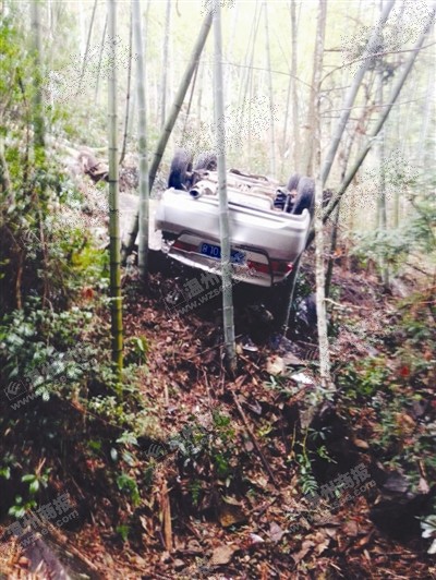 李先生31岁,在河北经商。2月21日,他借了舅舅的车子载着母亲,从永嘉岩坦田龙村开往枫林金山村的外婆家吃饭。下午2时许,车子行经永嘉岩坦镇金钟村附近,他突然感觉车子慢慢地往山体一侧偏离。“当时感觉车轮已经掉进山路边的排水沟中了。”李先生说,他赶紧往山体的外侧打方向,可能是方向打得有点过猛,车子失控,撞断路边的防护石墩,直接冲入了山沟并发生翻转,还好被半山腰的竹子挡住,车子四脚朝天地卡在竹林之中。