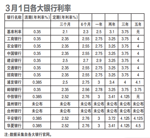 此次降息,与上次最大的不同是,存款利率上浮空间也做了调整,由原来的上浮上限1.2倍,上调至上浮上限1.3倍,即存款利率最高可在基准利率基础上上浮30%。由于3月1日是周日,温州的大部分银行表示,它们并未收到上级银行文件,目前按原有定期存款利率上浮幅度执行。