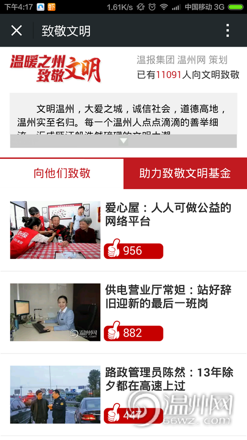 截至3月3日下午14时,已有11091人参与到致敬活动中来,还没来点赞的你,赶紧拿起手机,参与进来,为文明温州点个赞。