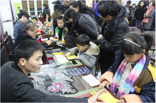 糖人、活字印刷、木雕、刻纸等非遗传承人设台摆阵,向社区居民展示他们的绝活,尤其瓯绣之针法繁多,做工精细,绣布上的猫栩栩如生,引来居民一致赞叹。