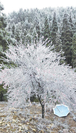 昨天,铜铃山森林公园主任王荣伟给商报发来雾凇照片。他说,铜铃山海拔700米以上区域,树木一夜之间结上了冰凌,山峰和树木被装扮得如同镶上了水晶,如此壮观的场景,去年冬天至今还不多见。至昨晚截稿时,冰仍未融化。
