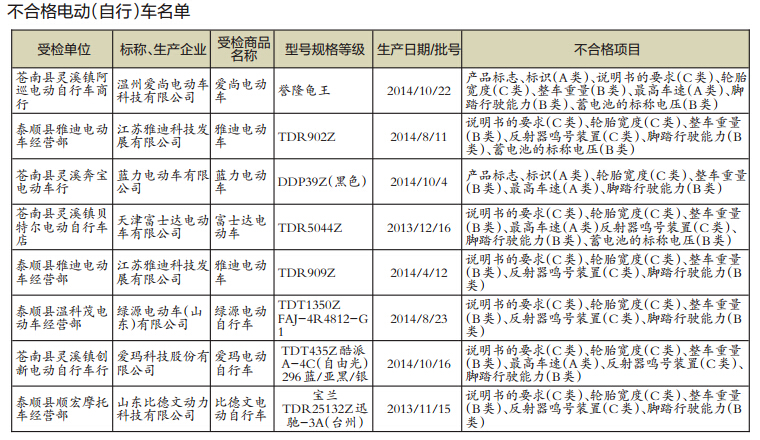 昨天,温州市市监局通报2014年度流通领域电动车及汽车配件质量专项抽查检验结果。经检验,抽检的10批次电动车中,有8批次不合格,不合格率达到了80%,其中包括绿源、爱玛等品牌的电动车。