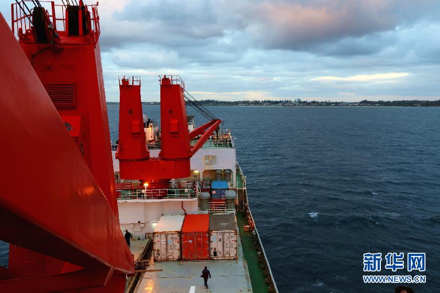 3月18日,搭载着中国第31次南极科考队的“雪龙”号驶向澳大利亚锚地。新华社记者白阳摄