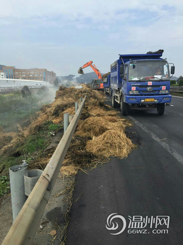 稻草被推到硬路肩上后,直到25日的下午1点,清理工作才又继续。浙江温州甬台温高速公路有限公司联系了一台挖掘机,在现场将稻草转运到一辆货车上,这项工作一直持续到25日晚上的20时40分。此时这次耗时近30个小时的清障工作才告完毕。