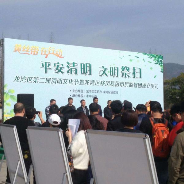 开幕式当天,河泥荡公园的广场经过了精心的布置与策划,两旁的宣传物不但向人们展示了清明节的各种风俗以及来历,而且也同样推出了文明祭祀,绿色殡葬等科学主题,倡导大家“平安清明·文明祭扫”。开幕式上,市民政局殡葬管理处、区民政局负责人授牌成立龙湾区移风易俗市民监督团,移风易俗市民监督团代表现场宣读了殡葬改革倡议书。活动结束后,区民政局又以刷殡葬改革微信公众号的方式,向民众发放小礼物。