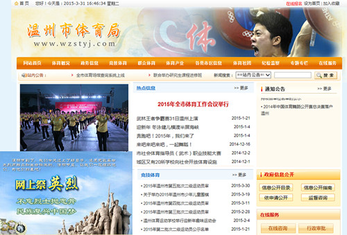 市体育局、市邮政管理局等部门网站更新明显严重滞后。记者打开市体育局网站,在位于显要区域的热点信息一栏中发现,最新的一条信息为2月16日的“2015年全市体育工作会议举行”,其他的大多信息为今年1月份,甚至还有2014年12月份信息。