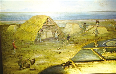 | 博物馆内展示的一幅大型瓯塑作品永嘉场“制盐场景”。 |