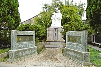 | 永昌堡博物馆的院子里矗立着“明抗倭英雄纪念碑”,碑上为王沛、王德两位英雄的塑像。 |