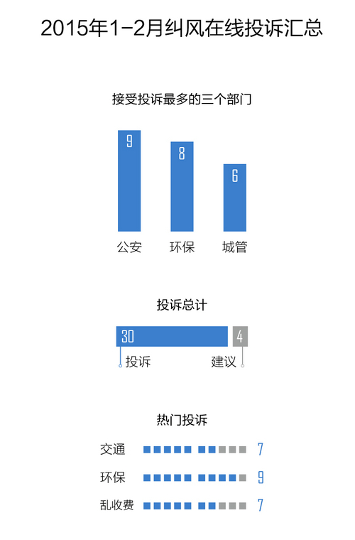 2015年1、2月,纠风在线共办结34件,其中投诉占30件,建议意见4件。