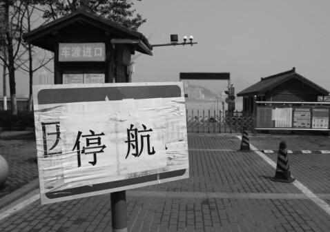 昨天上午9时许,市区安澜车渡码头的车辆入口处,摆放着一块醒目的提示牌,上面写着“停航”两字。入口处的收费岗亭内空无一人,离收费亭几米远处的一个房间内,有一名保安在值班。