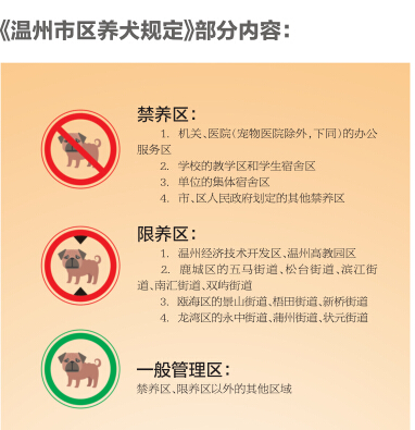 根据《温州市区养犬管理规定》,市区划为禁养区、限养区和一般管理区。机关、医院(宠物医院除外)的办公服务区,学校的教学区和学生宿舍区,单位的集体宿舍区,市、区人民政府划定的其他禁养区等属于禁养区。根据划分,市区鹿城区、龙湾区、瓯海区的主要街道都属限养区。《规定》写明,公安部门是市区养犬管理的行政主管部门,市政府设立的养犬管理协调小组办公室也设在公安部门。