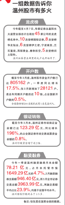 股市的火越烧越旺,一季度温州证券交易额同比上涨249%,占全国总交易额1.94%,其中两融交易额占比更是高于全国平均水平,3月份新增股民同比暴涨近10倍……今年亮丽的股市成绩把众多温州券商营业部打造成龙虎榜上的“新星”,其中华泰证券永嘉阳光大道营业部更是一跃进入全国前十,被称为最大黑马。