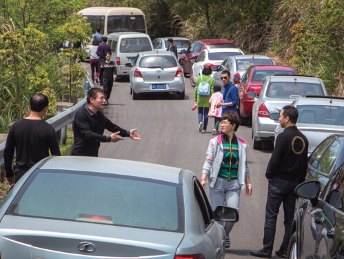 昨天,位于瑞安大南社区的圣井山上,红杜鹃引得数千游客。山脚停车场480个车位被塞得满满当当,不少游客甚至将车辆停在狭窄山路上,长达3公里的汽车随山路蜿蜒,蔚为壮观。上山、下山的车辆一时无法挪动,在11时30分到14时达到胶着状态。不少心急的游客不得不弃车,在山脚3公里外徒步上山。据一游客称,下山时,因山路被部分游客徒步上山后的“弃车”所阻,有六七人便合力将之抬开。后经交警指挥、限流后,拥堵情况才得以缓解。