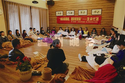 昨天上午10点,伴随着轻音乐,发呆比赛正式开始。29名选手,有的盘坐,有的躺着,有的闭眼,有的低头,有的抱着靠枕,姿势各异,发挥发呆功力,来了场PK赛。比赛有10分钟的预热时间,让选手们进入发呆的状态。