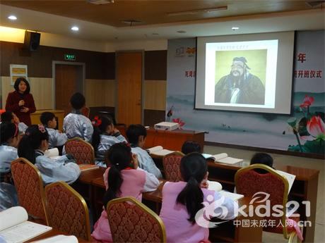紧接着,在班主任的带领下,诵读班学员身着汉服,面向孔子像以及老师,庄严的行起了古时拜师仪式。礼成之后,老师为学员送上国学书籍。来自区传统文化促进会讲师团成员、区实验小学张建芬老师为学员们上了开班第一课:《论语<学而第一>》。为了使孩子和家长们都能有所悟、有所得,张建芬老师举了许多生动的例子,和孩子们进行互动,大家都积极地参与到其中,在场的大人都时不时被孩子的天真有趣的回答给逗乐了,现场的气氛热烈欢快。
