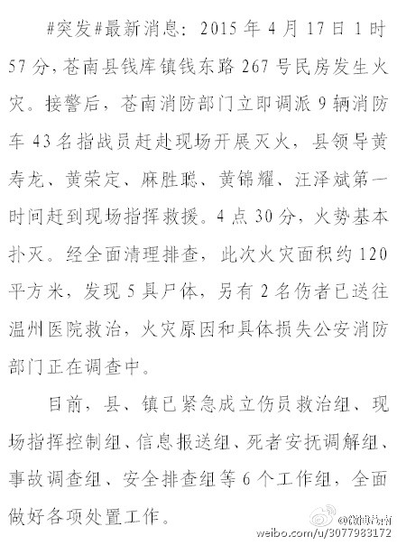 【发现5具尸体】2015年4月17日1时57分,苍南县钱库镇钱东路267号民房发生火灾。4点30分,火势基本扑灭。经全面清理排查,此次火灾面积约120平方米,发现5具尸体,另有2名伤者已送往温州医院救治,火灾原因和具体损失公安消防部门正在调查中。县、镇已紧急成立6个工作组,做好处置工作。