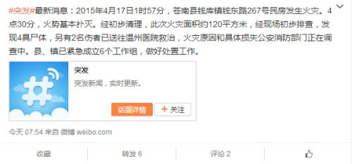 【发现4具尸体】2015年4月17日1时57分,苍南县钱库镇钱东路267号民房发生火灾。4点30分,火势基本扑灭。经全面清理排查,此次火灾面积约120平方米,发现4具尸体,另有2名伤者已送往温州医院救治,火灾原因和具体损失公安消防部门正在调查中。县、镇已紧急成立6个工作组,做好处置工作。