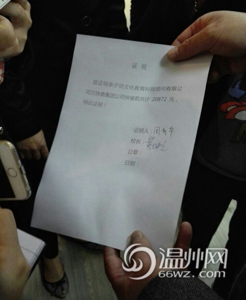 唐先生说,温州乔登美语培训机构共欠快餐款20872元,已经拖欠了2个半月。他还拿出一张有“黄坤元”签名的证明函。