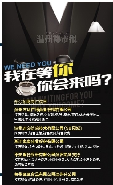 4月18日至19日(每天10:00~17:00),由温州市龙湾区人力资源和社会保障局、温州市龙湾区商务局、温州市龙湾区总工会主办,温州万达广场商业管理有限公司、58同城承办的“2015年龙湾区春夏综合人才公益招聘会”将在温州龙湾万达广场1号门外举行。