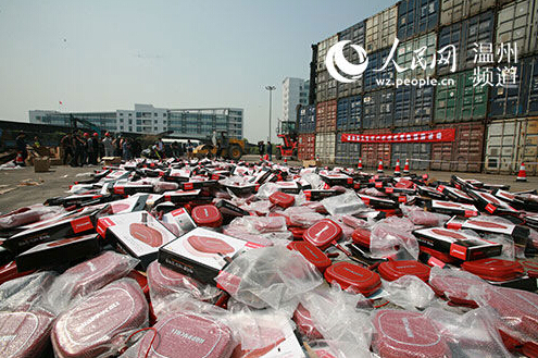 在“4·26世界知识产权日”来临之际,为了进一步震慑侵权违法活动,弘扬“诚信守法”的知识产权意识,今天上午,温州海关在温州龙湾金鑫码头举办知识产权侵权货物销毁活动,集中销毁了该关去年8月没收的4710个侵权煎锅。
