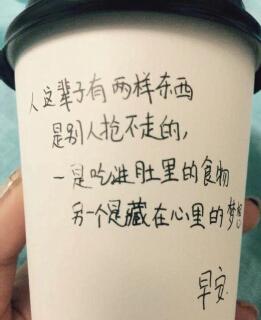 王羙宵每天都要抽空上网搜索一些励志话语,一笔一笔写在豆浆杯上。
