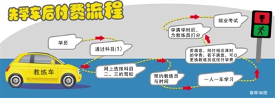 学员在通过科目1考试后,可根据自己的时间,在网上自主选择驾校、教练员、培训日期和培训价格。一个学时或几个学时结束后,根据满意度付费。不同驾校设有不同的价位与结算时段,支付宝、网银、转账等均可支付。