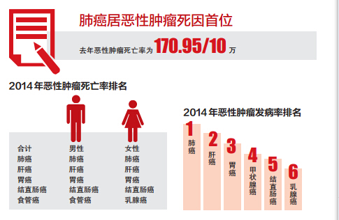 温医大附一院放化疗科主任谢聪颖介绍,无论国内外,肺癌的死亡率在恶性肿瘤中常年排首位,发病人数多,死亡率高。不过,值得一提的是,近年来肺癌患者的存活率有所上升。谢聪颖说,原先得肺癌很难被发现,一查出来就已经是中晚期。现在,越来越多的患者通过CT筛查在早期发现疾病,及早治疗;另一方面,先进的治疗方法也在逐步普及。所以,5年前,半数肺癌患者被查出患病后存活时间不超过一年;现在半数肺癌患者能存活约33个月。“目前,肺癌的病因不完全明确,但是可以肯定的是,有研究表明,肺癌和吸烟有着密切关系。”谢聪颖说,香烟中的致癌物质损害了支气管上皮细胞,引发细胞癌变导致肺癌。