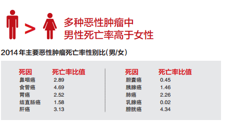 从性别来看,除乳腺癌等女性特有的恶性肿瘤外,鼻咽癌、食管癌、胃癌等多种常见的恶性肿瘤,男性死亡率均高于女性。