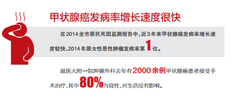 温医大附一院肿瘤外科主任医师周素梅说,甲状腺癌发病率增高可能与检出手段普及、环境因素等有关。甲状腺癌致死率低,即使是恶性肿瘤,以现有的诊疗技术,甲状腺癌术后十年的生存率也达到了90%。甲状腺癌在女性中为何发病率较高?周素梅解释,这和女性甲状腺组织中存在的雌激素受体有关。
