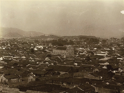 | 英国外交官阿尔巴斯特(Chaloner Alabaster,汉名阿查理)1877年拍摄的温州城区,照片下方能清晰地看见三牌坊中的两座牌坊。 |