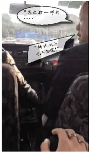 听了教练的脏话后,坐在后座的拍摄者似乎也听不下去了。视频第46秒处,在教练下车的间隙,拍摄者在镜头前通过做手势表达自己的不满。