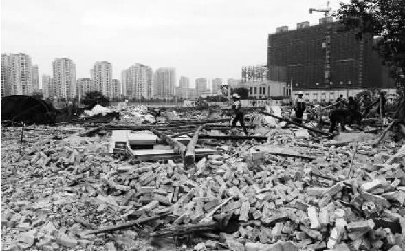 当天,由鹿城区政府、温州市城市建设投资集团有限公司牵头,南汇街道联合区行政执法局、国土资源局鹿城分局等职能部门,依法对516亩地块内近5000平方米违法建筑实施拆除,两户符合拆迁补偿政策的,经南汇街道全力攻坚,也已完成协议签订,当天一并拆除。上午7点半,在两台挖机的合作下,一幢幢楼房应声倒下,掺杂在空地内的民房也都夷为平地。不久的将来,这里将会成为市府路上一道靓丽风景线,与中央绿轴交相辉映。