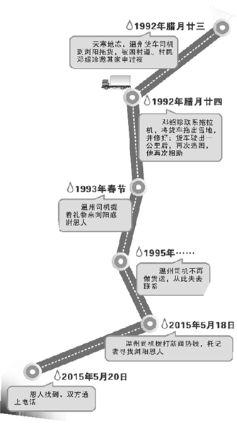 今天本报的这个报道,两个人物都让人感动,一个是素昧平生、出手助困的浏阳人邓绍珍;另一个是受人滴水之恩,挂念23年至今仍要寻找恩人的温州人章建忠。