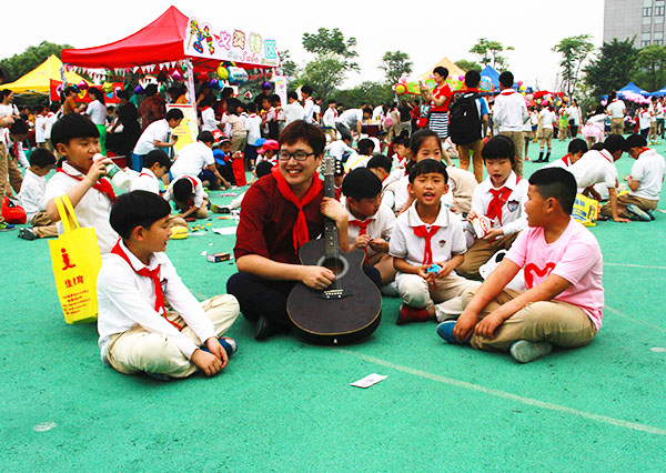 图为外国语小学老师带领学生现场吟唱古诗,庆“六一”。陈智慧摄