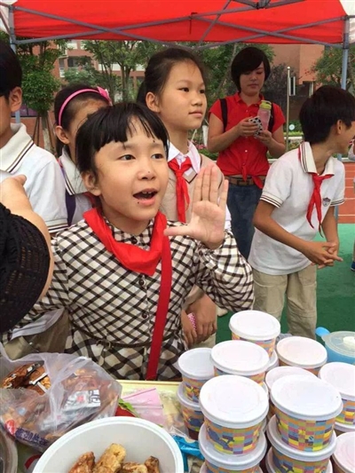 一大早区外国语小学里已传来各种叫卖声,一顶顶帐篷下面摆着各类书籍、植物、手工作品、食物等小摊,而摊主则是学校的学生,当天,他们将通过卖出自己的商品,筹集资金,并捐入学校成立的“红领巾基金”。