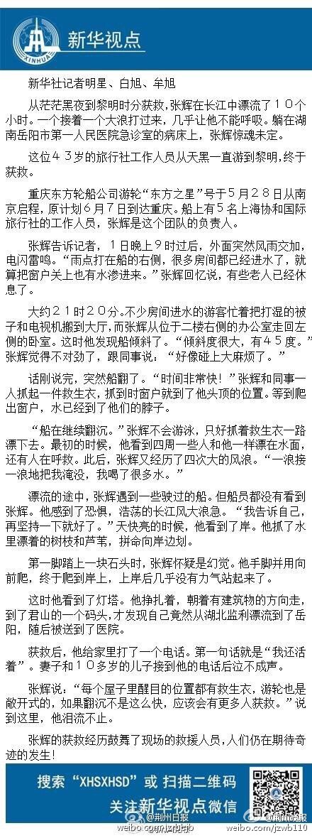 【“东方之星”幸存者张辉:如果沉得不是这么快,应该还会有更多人获救】张辉是旅行社工作人员,据他获救后透露,当夜风雨很大,夜里9点多船突然就倾斜了45度,随后就翻了,船翻的速度之快,以至于他只够时间抓起一件救生衣。在随后的十个小时中,因不会游泳,他一路漂流到了岳阳君山,最终获救。