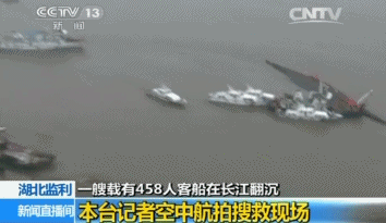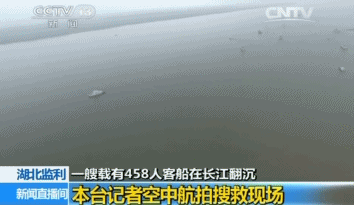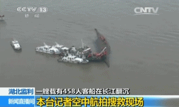 【航拍载458人游轮翻沉搜救现场 439人生死未卜】昨晚,载458人的“东方之星”游轮,在长江中游翻沉,截至15时许,共救出19人,其中14人生还,还有439人生死未卜。翻沉游轮高18.6米,事发水域水深11.7米,也就是说游轮已触及江底。目前已有50多艘搜救船在现场搜救。关注!@央视新闻