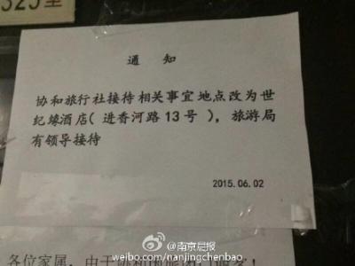 【旅游局设临时接待点,家属可前往】省市旅游部门在进香河的世纪缘酒店设临时接待,接待家属。公安部门在协和旅行社南京分公司门上贴出了最新方案,指导家属去世纪缘!扩散!@南京晨报