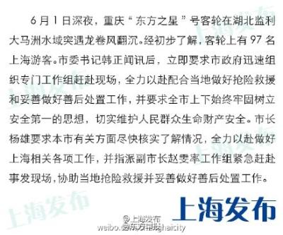 【"东方之星"客轮翻沉,有97名上海游客】经初步了解,客轮上有97名上海游客。上海市委书记韩正闻讯后,立即要求市政府迅速组织专门工作组赶赴现场。市长杨雄要求本市有关方面尽快核实了解情况,全力以赴做好上海相关各项工作。@东方早报