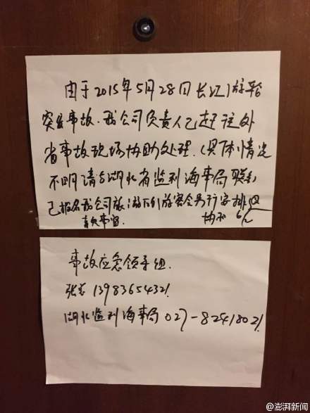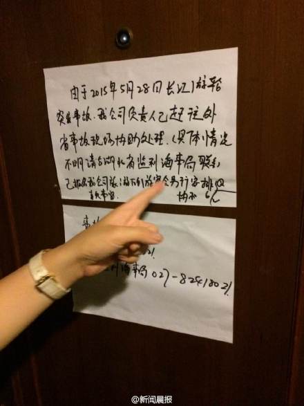 【协和旅游大门紧闭,负责人已赶往事故现场】上午9点,记者赶到协和旅游上海营销中心。公司门口贴着一张告示,并留有一个姓张负责人联系电话。对方称是重庆某船务公司负责人,并称东方之星是协和旅游包的的,船上406个游客都是夕阳红旅游(记者:邬林桦、李晓明)最后一张图为家属,记下号码匆匆离开。@新闻晨报