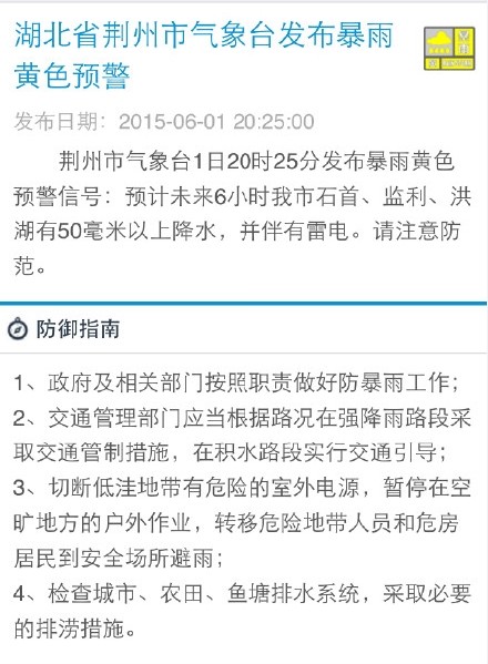 【曾发布暴雨告警】事故发生前两个小时,气象部门对石首监利曾发布暴雨告警。