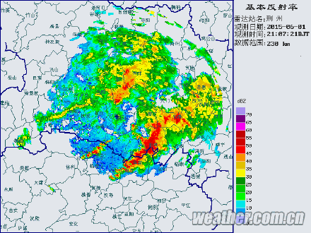 【科普】据中央气象台雷达监测资料分析,6月1日20时以后,有一条带状雷暴回波自西向东经过监利县,雷达观测到的最强回波21时06分出现在监利西南侧15公里处,强度为50dBz,回波高度7-9公里,移动速度30-40公里/小时。