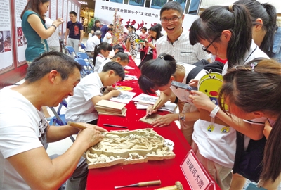 6月13日是我国第十个“文化遗产日”。昨天,龙湾区将14个本土特色的饮食类和手工艺类非物质文化遗产项目搬进龙湾区万达广场,与市民进行零距离接触,让更多人了解非物质文化遗产的独特魅力。图为市民在“非遗”艺人指导下进行雕刻创作。