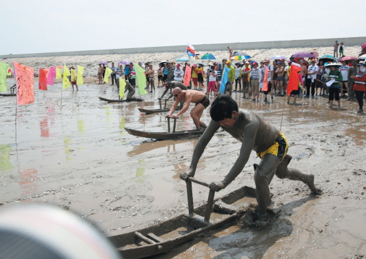 6月14日,浙江省首届生态运动会暨温州泥巴节龙湾区第六届滩涂趣味运动会邀请赛在该区东海大堤永兴五溪段举行,共有25支代表队350余名运动员先后参加了踩泥马、背媳妇、过独木桥运鱼接力、拔河等趣味项目的角逐,旨在宣传“五水共治”和健康体育运动,助推两美温州建设。据了解,温州“泥巴节”从2010年开始举办。比赛中,运动员尽管身上满是泥巴,但是每一张脸都笑容灿烂,前来围观的市民也是看得不亦乐乎。(叶晓东李希赛摄)