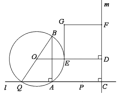 如图,点A和动点P在直线l上,点P关于点A的对称点为Q,以AQ为边作Rt△ABQ,使∠BAQ=90°,AQ∶AB=3∶4,作△ABQ的外接圆O.点C在点P右侧,PC=4,过点C作直线m⊥l,过点O作OD⊥m于点D,交AB右侧的圆弧于点E.在射线CD上取点F,使DF= CD,以DE,DF为邻边作矩形DEGF.设AQ=3x。